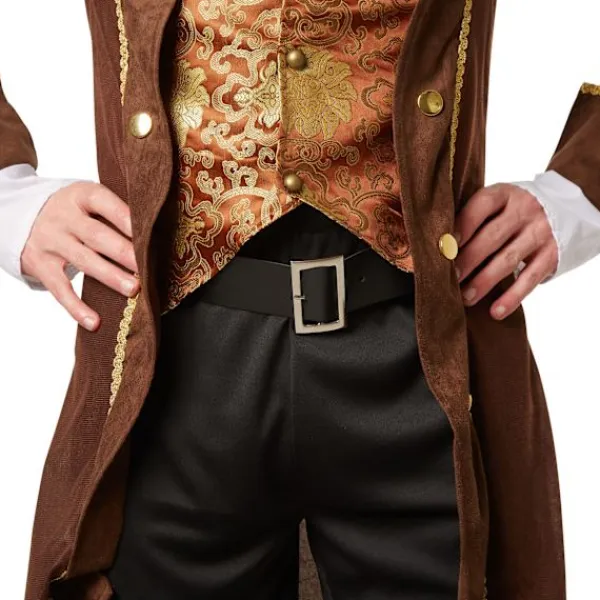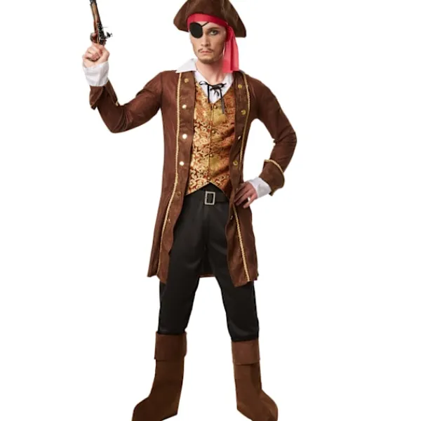 Maskeraddräkten Sjörövarhövding består av en kappa med påsydd väst och påsydd skjorta, byxor, hatt med rött band, bälte, ögonlapp och ett par stövelmanschetter. Material: 100 % polyester.
