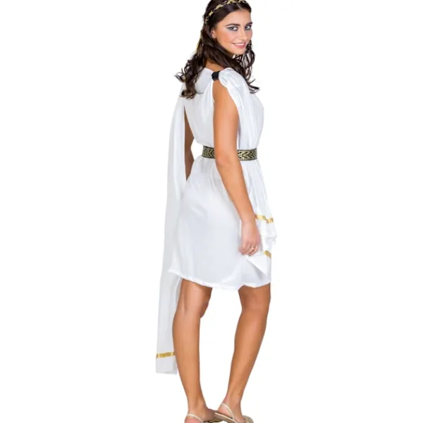 Maskeraddräkten vacker Tojanska består av en underbar kort klänning med vattenfallsurringning, ett påsytt långt band och ett glittrande skärp med ett antikt mönster och kardborreband. Ett diadem med brun konsthårsfläta och inflätat guldband medföljer också. Material: 100 % polyester.