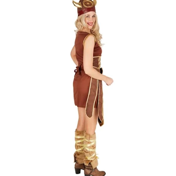 Maskeraddräkten viking prinsessa består av en klänning, ett förkläde, en hatt och benvärmare, material: 100 % polyester.