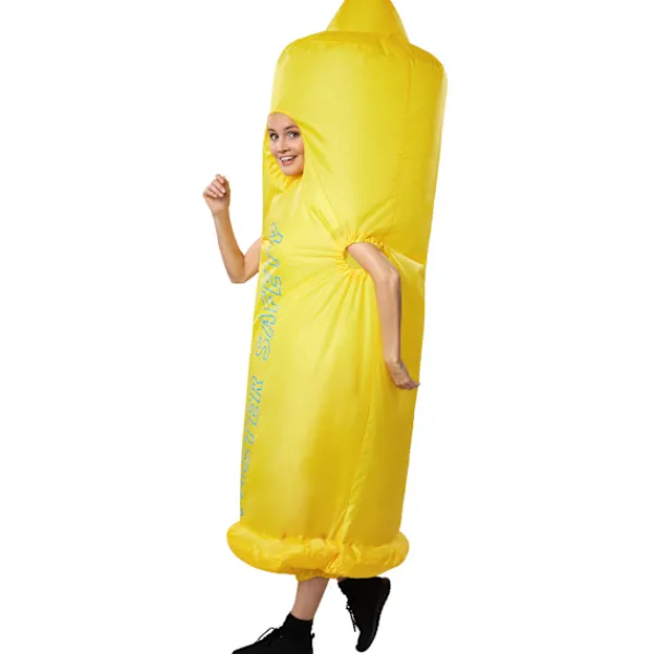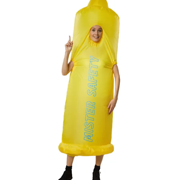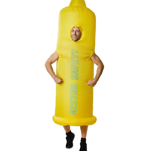 Säkerheten först: I dräkten Uppblåsbar kondom är du ett iögonfallande och lustigt blickfång på alla fester. Dessutom har du licens att beblanda dig i den här dräkten, för som det tydligt står på framsidan: Du är “Mister Safety”, en speciell typ av dörrvakt. Den som närmar sig, kommer inte förbi.