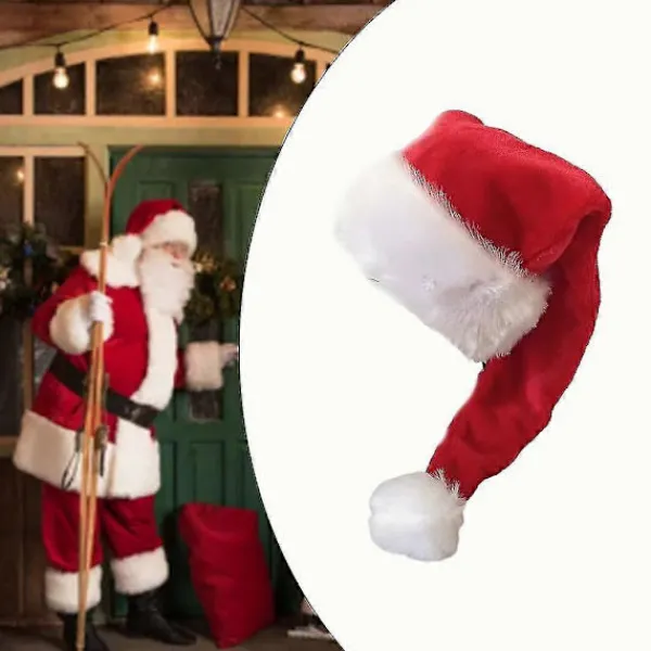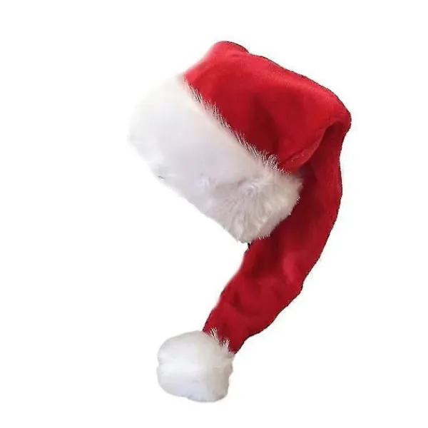 Denna festliga tomteluva är prydd med tjockare plysch och vit brätte.