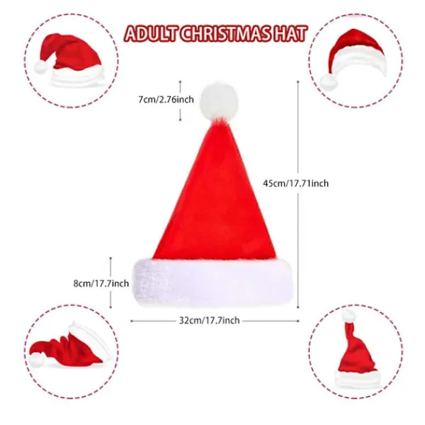 STORLEKSTIPS FÖR VÅR TOMTELUVA: Storlek 32 x 45 cm (B x H), passar de flesta vuxna. Tomteluvan är tillverkad av förtjockat, fluffigt och plyschigt material, vilket gör den mycket mjuk och bekväm att bära. Fördel: Tomteluvan är färgbeständig och slitstark, vilket gör att den kan återanvändas många gånger. Den kan tvättas och återanvändas. Gåva till din familj: Den klassiska tomteluvan är vackert designad med ett vitt extra tjockt plyschband och pom-pom-topp som alla dina familjemedlemmar kommer att älska. GÅVA TILL DIN FAMILJ: Klassisk hatt är vacker med vitt extra tjockt plyschband och pom-pom-topp som alla dina familjemedlemmar kommer att älska. Komfort: Den mjuka plyschtexturen gör tomteluvan bekväm att bära, även under långa perioder. Inget kliande eller obehag – bara ren komfort.