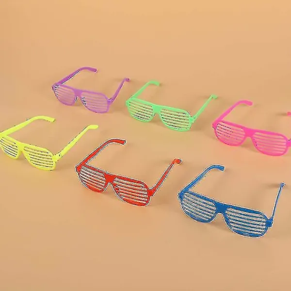 Ett utmärkt sätt att skapa en glad atmosfär och sprida skratt och glädje bland både barn och vuxna. Funktioner Färg: Gul, Lila, Blå, Rosa, Röd, Grön. Material: Plast. Storlek: 15 x 14 x 5 cm. Tillverkade av material av högsta kvalitet, hållbara, lätta och bekväma att bära. Shutter shades finns tillgängliga för både vuxna och barn. Det perfekta tillbehöret att använda under födelsedagsfester och andra evenemang. Detta gör att du ser mer cool och trendig ut än andra festgäster. Perfekt för födelsedagsfester, julfester, neonfester, ravefester, halloweenfester och andra tillfällen du ska delta i. Även bra för goodie bag-fyllningar, festpresenter, giveaways och spelpriser. Packlista 50 x glasögon