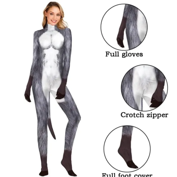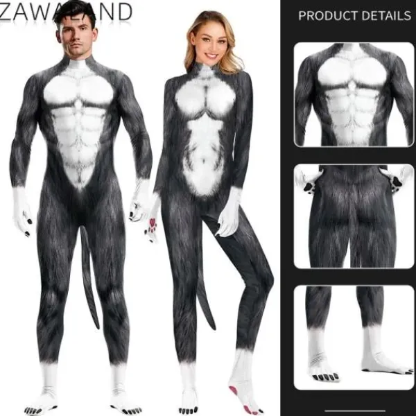 Zawaland Djur Catsuit Par Snövarg Kostym med svans gren Dragkedja Halloween Party Cosplay Outfit Förklädnad Zentai Bodysuit
