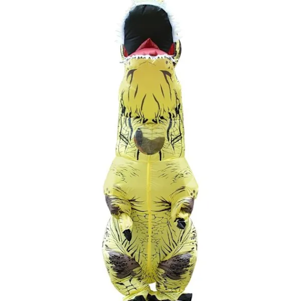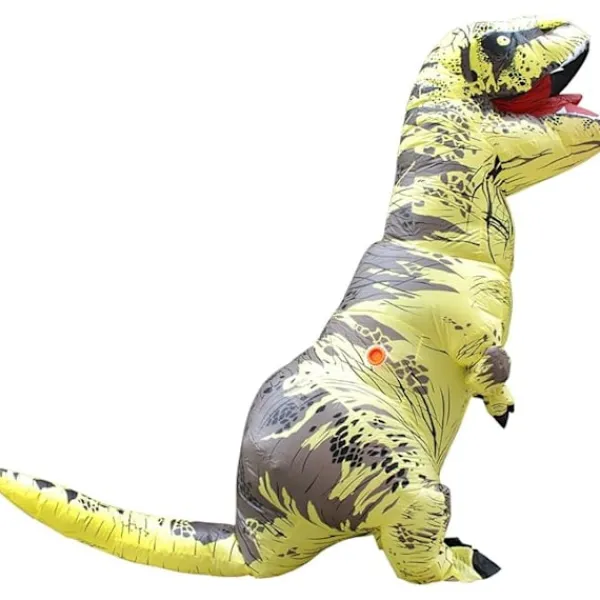 Färg: gul dinosauriedräkt. T-rex-dräkten ser väldigt realistisk ut, gigantiska dinosaurier är vilda och söta.
