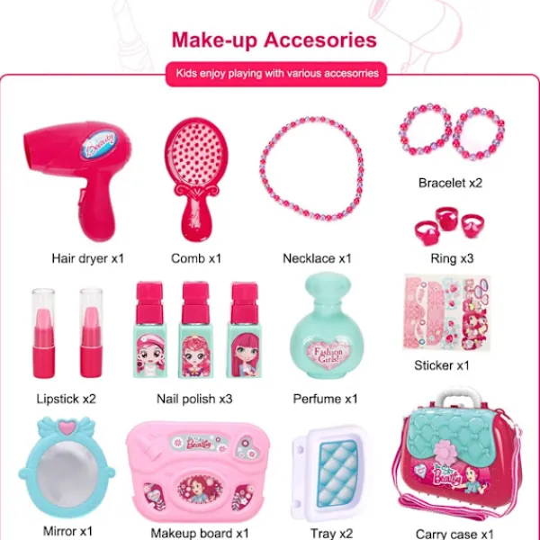 Din skönhetsälskande lilla flicka kan bli makeup-artist, frisör eller nagelkonstnär med detta unika lekset. Genom denna rollspel kan barns fantasi, kreativitet, tänkande och manuella färdigheter stimuleras.;Ljusa färger hjälper till med visuell träning och gör människor glada, så denna leksak är bra för tidig utbildning, är den bästa presenten till små flickor!;Ryggsäck, axelväska med justerbar rem Mycket bärbar och kompakt design kan förvara alla små föremål, lämplig för utomhusbruk, används även som handväska, mycket praktisk.;Hög kvalitet Tillverkad av ABS-plastmaterial, med slät kant, inga repor, ingen stickande lukt och säker kvalitet, föräldrar kan vara lugna! Utsökta detaljer Slät kant, mycket olika leksakstillbehör, perfekt för rollspel, berika barns andliga värld.;Denna smyckespåse kan användas som en förvaringslåda hemma, förvara alla dina små föremål, lätta att söka. Inklusive 22 tillbehör för lek, den är mycket liten och bärbar för utomhusbruk. När det gäller utomhusscener kan den förvandlas till en trendig handväska eller en axelväska med justerbara remmar. Lätt stängning Trendig täckning Förfinade detaljer