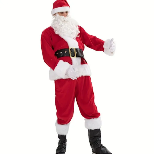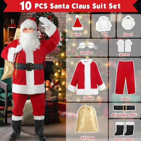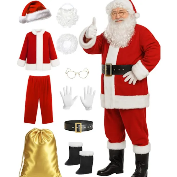 9-delad tomtekostymset innehåller: Denna tomtekostym för män inkluderar en plyschtomtejacka, byxor, en tomtemössa, ett bältesspänne, stövlar med vita plyschmanschetter, handskar, en peruk, glasögon, ett skägg och en presentpåse!