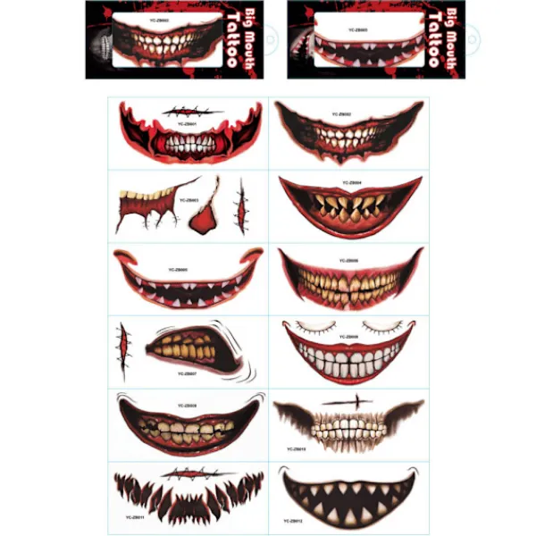 [Tillförlitligt Material] De färgglada tillfälliga tatueringarna är gjorda av miljövänliga material och säkra att använda. Den falska tatueringsdekalen kan appliceras på vilken hud som helst, oavsett barn eller vuxna. De är vattentäta och håller i 3-5 dagar. Till och med längre. [Paket] Du får 12 ark Halloween Prank Makeup Tillfälliga tatueringar, använd för tillfälliga tatueringar ansiktsdekaler prank rekvisita för Halloween cosplay party DIY dekorationer. [ Dödsdagens Tatueringsdekaler] Tillfälliga tatueringar är säkra att applicera på ansiktet, armen, örat, halsen, händerna, pannan, fingrarna, bröstet, armen, bröstet, axeln, ryggen, midjan, handleden, Halloween ansiktsmakeup-kit, låren, benen, vristen, fötterna och vilken del av kroppshuden som helst. [Tips för användning] Se till att använda tillräckligt med vatten för att överföra till huden och fläkta sedan torrt så att det inte rör sig. Försök också att hålla ett ”lätt” leende medan du applicerar så att problem som sprickor inte uppstår när du talar. Använd eyeliner eller läppstift för att fylla i sprickorna, citronolja hjälper till att ta bort dem. [Halloween Clown Horror Mouth Tattoo Stickers] Vackra och realistiska Halloween-element tillfälliga tatueringar för att skapa din unika personlighet. Tatueringsdekaler ser väldigt verkliga och naturliga ut, fria att skapa din unika. Lämplig för att dela med familj och vänner.