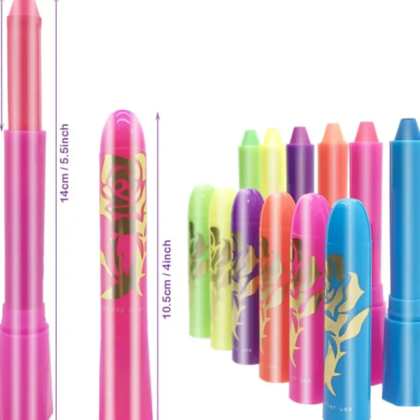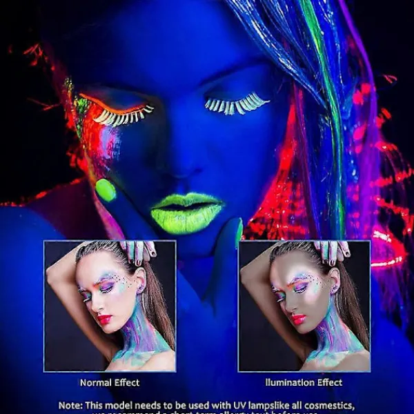 LYSER I SVART LJUSFÄRG: Den fluorescerande ansiktsfärgen har livfulla färger i naturligt ljus, efter att vi använt dessa kritor för ansikts- och kroppsmålning kan sminket lysa spektakulärt under svart ljus, men de kan inte lysa i mörkret direkt.