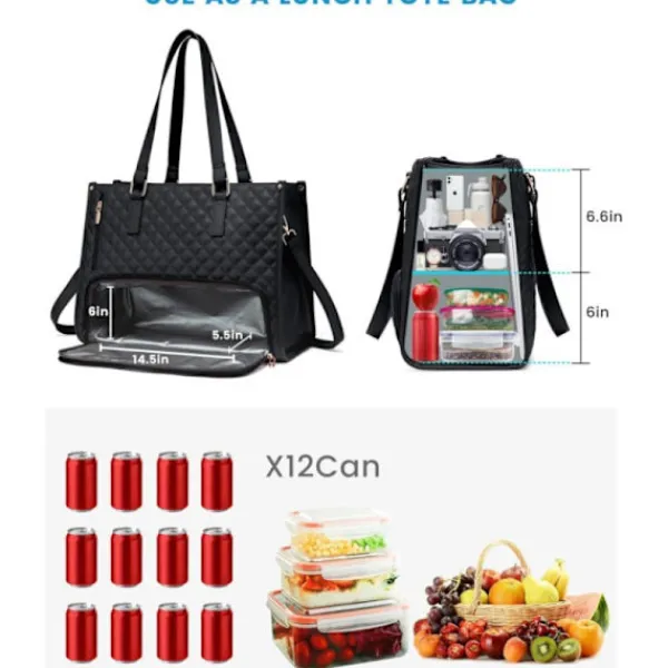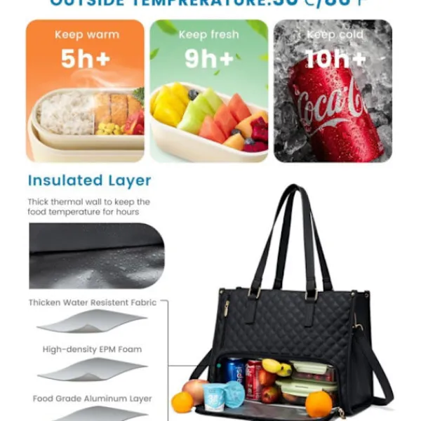 Denna mångsidiga väska kombinerar en professionell laptopväska med en isolerad lunchväska. En unik, hopfällbar avdelare separerar din laptop, dokument och mat, vilket eliminerar behovet av flera väskor. Perfekt för att smidigt växla mellan arbete och vardag. Isolerad och läcksäker: Lunchavdelningen håller maten fräsch i upp till 5 timmar och drycker (med kylklampar) kalla i över 10 timmar. Den rymliga insidan har plats för flera matlådor, frukt, snacks och upp till 12 burkar läsk. Vattentät, lätt att rengöra och livsmedelssäker för bekymmersfri användning. Mångsidig förvaring: Väskan har gott om utrymme och flera fack. Den nedre avdelningen (36,8 x 15,2 x 14 cm) rymmer dagligvaror och frukt, medan den övre avdelningen är utformad för en 15,6-tums laptop, laddare, anteckningsböcker och kontorsmaterial. Perfekt för hektiska yrkesmänniskor. Skydd för laptop: Denna väska skyddar effektivt mot stötar och repor. Flera invändiga fickor håller laptop, laddare, böcker, dokument och andra tillhörigheter organiserade. Idealisk för yrkesverksamma, studenter och affärsresenärer. Perfekt gåva: Med sin stilrena, akademiska design passar väskan för universitet, arbete, strandutflykter, picknick och camping. En praktisk och elegant gåva för mors dag, födelsedagar, alla hjärtans dag eller jul, som tillför komfort och stil till vardagen. Specifikationer: Material: Vattentätt, livsmedelssäkert material Laptopstorlek: Upp till 15,6 tum Nedre avdelning: 36,8 x 15,2 x 14 cm Funktioner: Isolerad, läcksäker, flera fack Användning: Arbete, studier, resor, picknick
