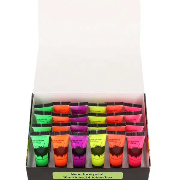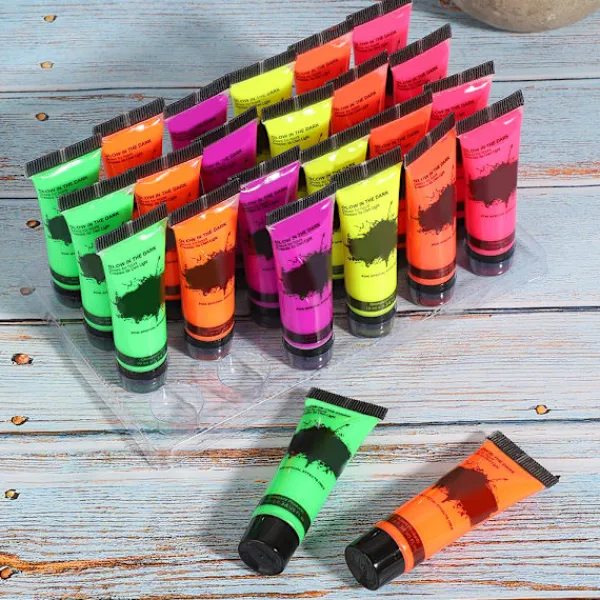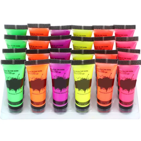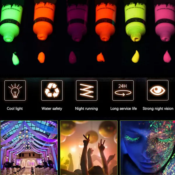 1. Pigmentet är fint, färgen är ljus och adsorptionen är stark, säker, giftfri, ofarlig och luktfri. 2. Under neonljus ser du att effekten av dessa mönster blir ljusa i mörkret. 3. Du kan enkelt ta bort sminket genom att torka av det med pappershanddukar eller tvätta med vatten. Du kan applicera kroppspaint på dina favoritmönster. 4. Den perfekta presenten till vänner, familj eller dig själv, som även kan vara det bästa valet för Halloween. 5. Lämplig för många platser inklusive födelsedagar, festivaler, klubbar, konserter, karnevalfester, fester och alla platser med belysning.