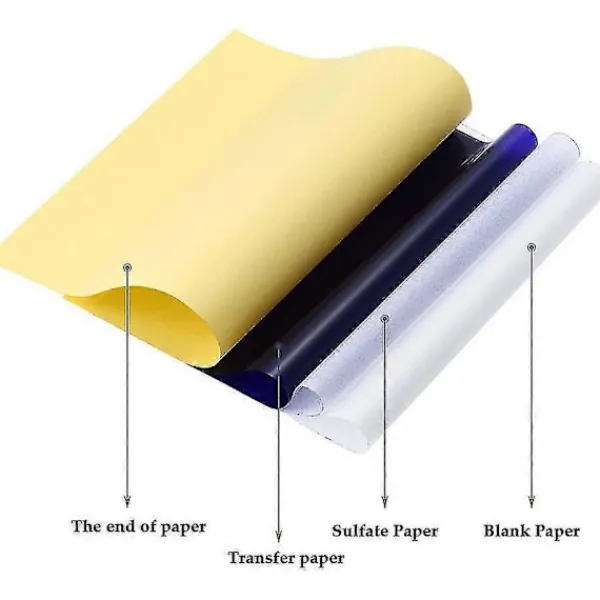 1. Särskilt lämplig för nybörjare och tatuerare. 2. A4-storlek: ca 21 cm x 30 cm (8,2 tum x 11,8 tum). 3. Varje ark innehåller fyra lager: 1) vitt lager 2) genomskinligt lager 3) karbonlager 4) bottenlager (gult). 4. Högkvalitativt termiskt överföringspapper säkerställer att linjerna du överför är skarpare och lättare att överföra till din hud. 5. Professionellt överföringspapper för tatuering eller stencil. Bleknar inte och är återanvändbart.