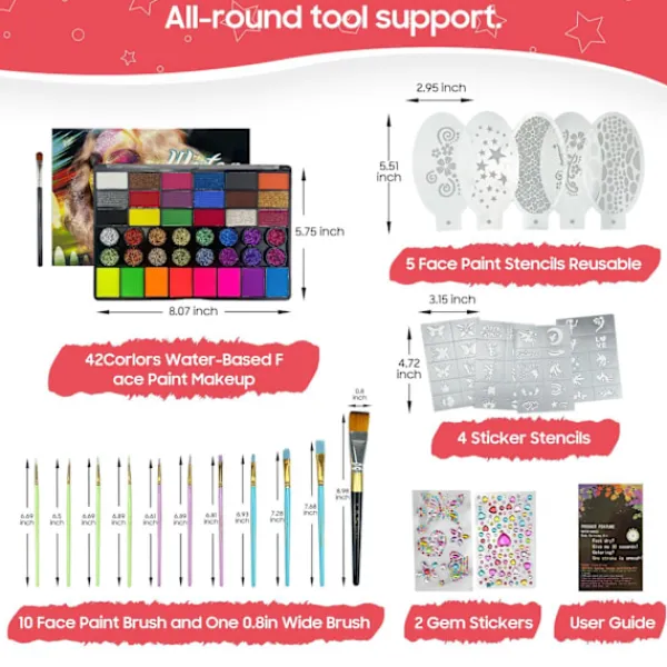 Rika och Lättanvända Verktyg: Inkluderar flera penslar i olika storlekar, ädelstensklistermärken, en användarhandbok, etc. Omfattande verktyg, enkel användning, lämplig för interaktion mellan föräldrar och barn och barnkalas, vilket enkelt uppnår kreativ ansiktsmålning.