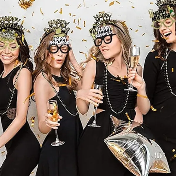 Nyårsglasögondesign: Nyårsglasögonen har 3 olika färger, svart, guld och silver, olika färger kan matchas med olika outfits, och varje glasögon är dekorerade med orden Gott Nytt År, ett bra val för festdekoration; Dessa nyårsglasögon har nya hattformer, glasögonen glittrar, fulla av personlighet, utsökt utförande och vacker design, orden Gott Nytt År på glasögonen gör dem till idealiska dekorationer för att ta foton på nyårsfester