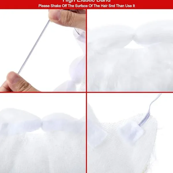 Var uppmärksam på: efter att du har fått dessa Santa-kostymtillbehör, vänligen skaka av håret på ytan innan du använder det, på grund av lite flytande hår på skäggens yta, men de kommer inte att påverka din användning.