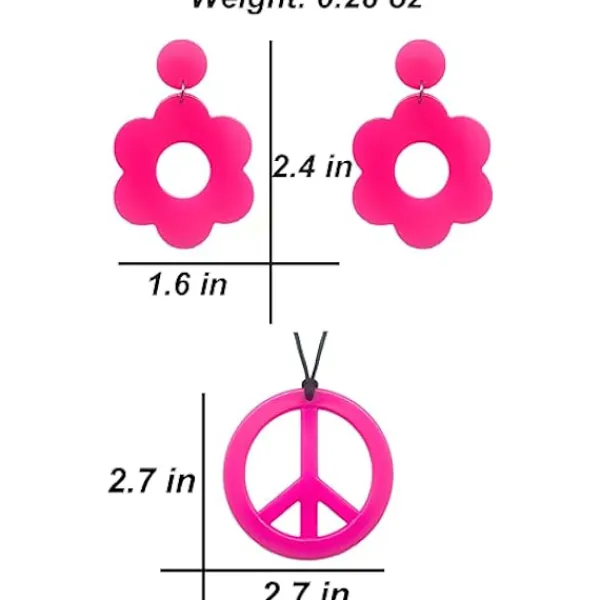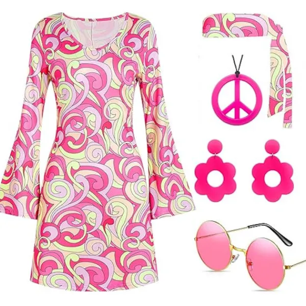 60-tals 70-tals disco hippie kostym: 5 delar, inklusive 70-tals klänning, disco pannband, hippie glasögon, blomma örhängen, fredsmärke halsband.