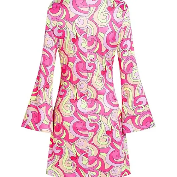 60-tals 70-tals hippie disco outfits: 60-tals 70-tals hippie discoklänning, Vintage tryckdesign, Rund hals design, Bell långärmad, 60-tals 70-tals hippie disco tillbehör.