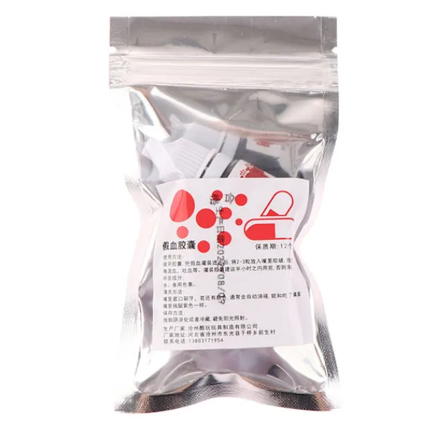 Placera en av blodkapslarna i munnen, bitade blodströmmar sipprar från munnen när du knaprar den (sväljning är inte tillåtet!).