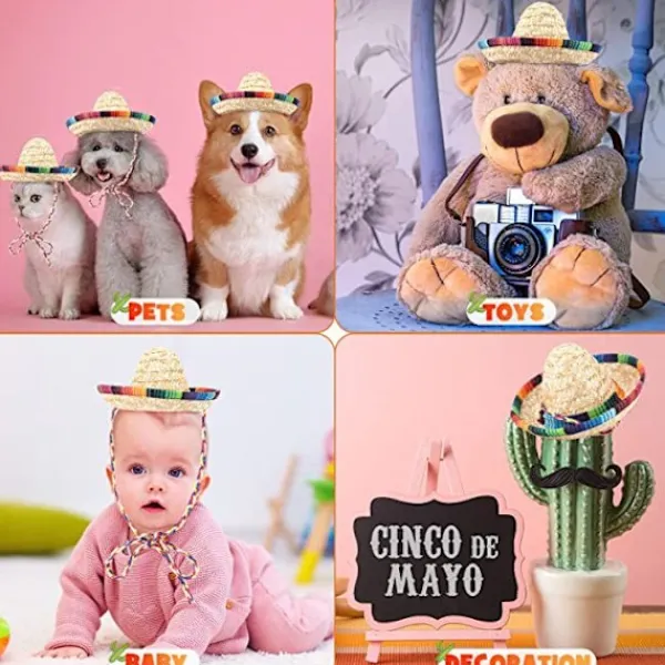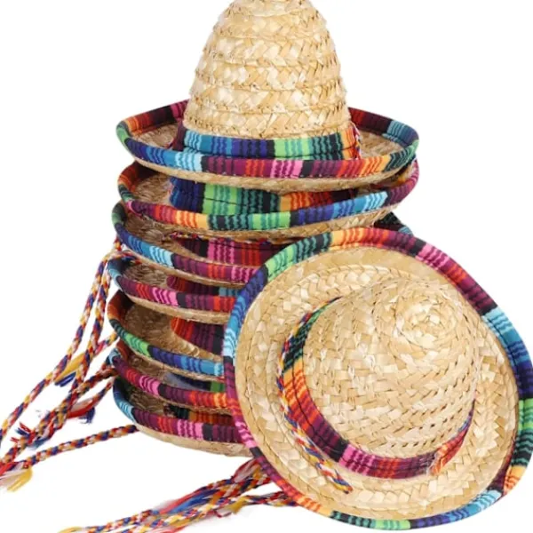 Mini storlek, sombreros diameter 5,9 tum; rep längd: 33 tum. 8 st Mini Sombrero Partyhattar gjorda av naturligt halmmaterial, hållbara. Passar för husdjur/fest/bordsdekorationDe mini sombrerohattarna kommer omedelbart att återställa sitt ursprungliga utseende, även om