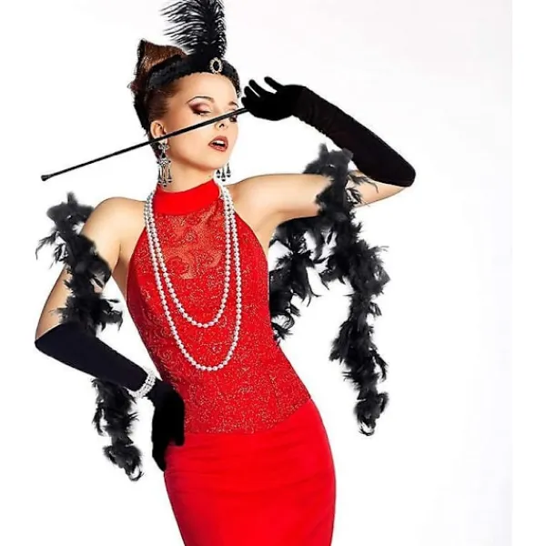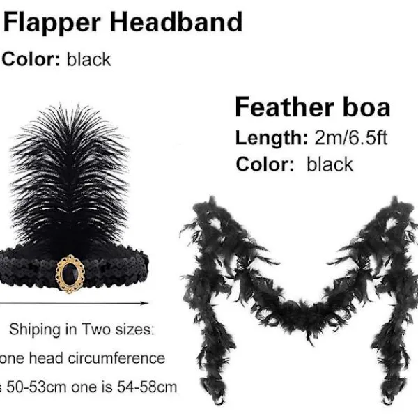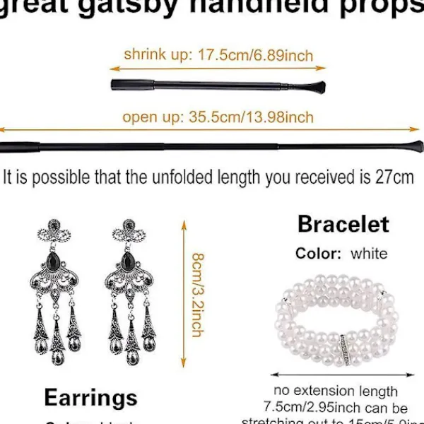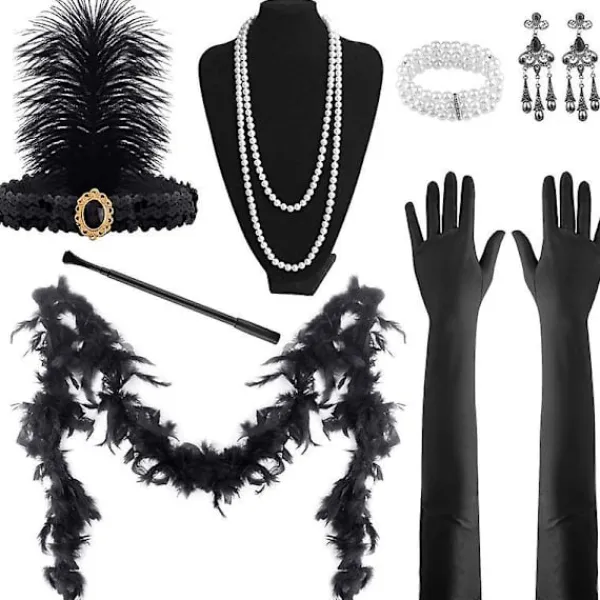 GREAT VALUE PACKtotal 9 pieces1 pair black long gloves(2pcs); 1 pair earrings(2pcs); 1 pcs pearl necklace; 1 pcs great gatsby handheld props; 1 pcs flapper headband; 1 pcs artificial pearl bracelet; 1 pcs black feather boa