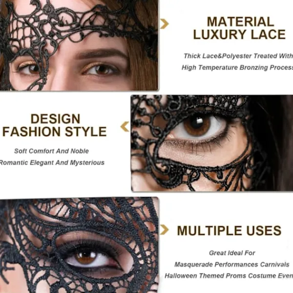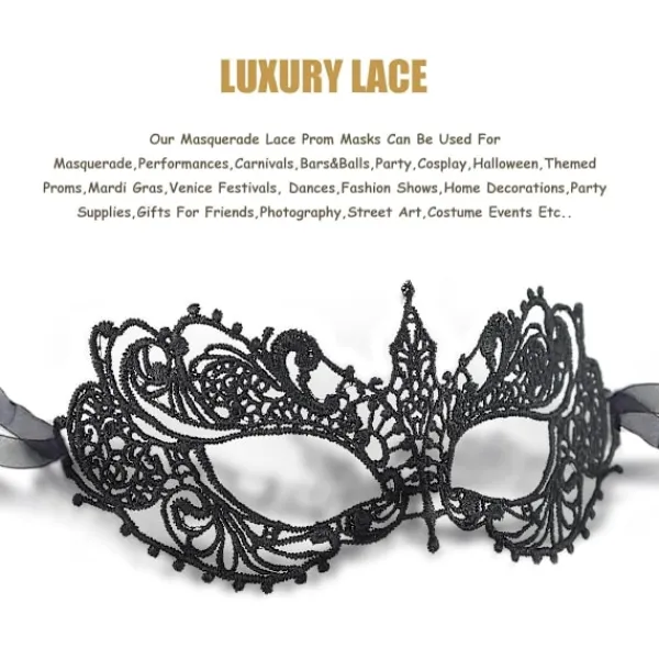 Brett användningsområde. Våra maskeradmasker i spets kan användas för maskerad, föreställningar, karnevaler, barer & baler, fester, cosplay, Halloween, temabaler, Mardi Gras, Venedigfestivaler, danser, modevisningar, heminredning, festartiklar för vänner, fotografering, gatukonst, kostumevenemang etc. Skönhet och komfort samexisterar. Maskeradmasken är utrustad med ett svart band som kan justeras efter din ansiktsform. Storleken passar nästan alla. Den är bekväm och lätt att bära och irriterar aldrig din hud, vilket gör att du fullt ut kan tolka den vackra modecharmen. Nya uppgraderade material. Våra spetsmasker är gjorda av tjock och exklusiv spets och polyester, behandlade med högtemperaturfixering. Med kombinationen av mjukt spetsmaterial kommer den klassiska svarta färgen inte att blekna efter upprepad användning. Den härliga och unika ihåliga designen gör dig till bollens superstjärna. Drottningens hemlighet. Våra maskeradmasker i spets har en unik stil och kommer att göra dig omedelbart romantisk och elegant. Öppna din själs bojor, bär sedan de mystiska maskerna, du är glamournattens drottning! Alla har rätt att vara en drottning, och ditt avstånd från drottningen är bara en perfekt mask! Mystisk och lyxig design. Klassisk spetsmask är alltid ledande inom trenden för damers maskeradmasker. Den har en snygg ihålig spetsdesign, samt utsökt design och mjuka spetsmaterial. Den är full av mystik och även bekväm, romantisk, ädel och elegant vilket ger dig olika frestelser.