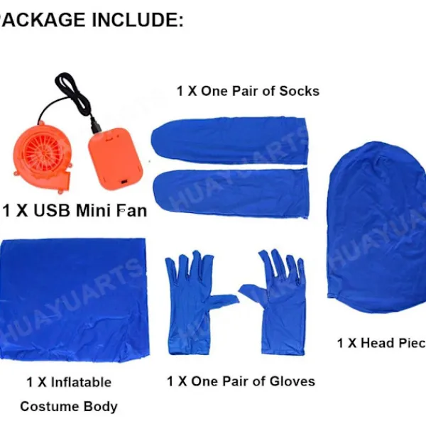 PAKETET INNEHÅLLER: Helkroppsdräkten passar de flesta vuxna. Paketet innehåller en uppblåsbar helkroppsdräkt, en huvuddel, ett par handskar, ett par strumpor och en luftfylld fläkt. Den luftfyllda fläkten kräver 4 AA-batterier och USB-ansluten mobil ström. Elmotor i påse (batteri ingår ej).
