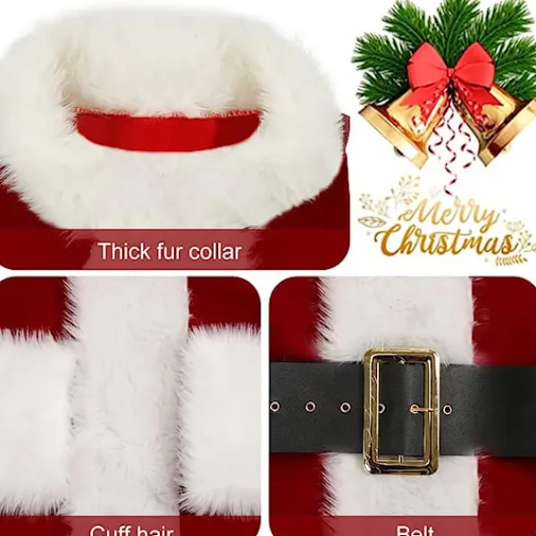 Egenskaper för jultomtens kostym – Framsidan av jackan på denna lyxiga jultomtekostym är designad med dragkedja för enkel att bära, med elastiskt bälte i midjan, svart bälte med metallspänne och elastiskt bälte på skägget. Peruken är också väldigt elastisk, så denna lyxiga jultomtekostym passar de flesta.