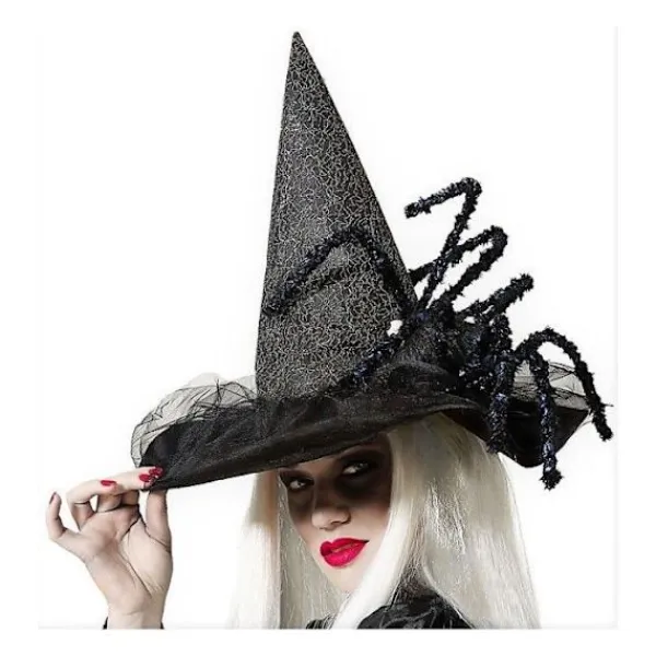 Tillbehör för utklädnad Kvinna Halloween Svart Häxhat med SpindelFör att komplettera en häxutklädnad, här är en fantastisk svart hatt med slöja och en stor spindel av sprucken blå tyg!Innehåll i paketet:En svart filt-hatt, spetsen är dekorerad med silvertråd, kanten inkluderar en stor slöja som faller ner över ögonen, ovanpå är en stor spindel av satintyg i sprucken blå färg sydd, med svart päls och 2 stora vita ögon.