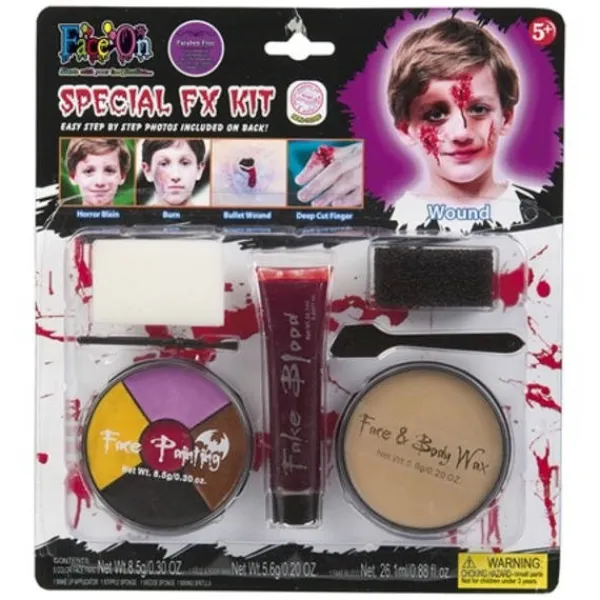 Smink för halloween. Innehåller oljebaserade ansiktsfärger (gul, svart, rosa, brun och röd), vax för ansikte och kropp (8,5g), vattenbaserat teaterblod (26.1ml), 2st svampar, pensel och plastpalett.