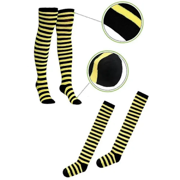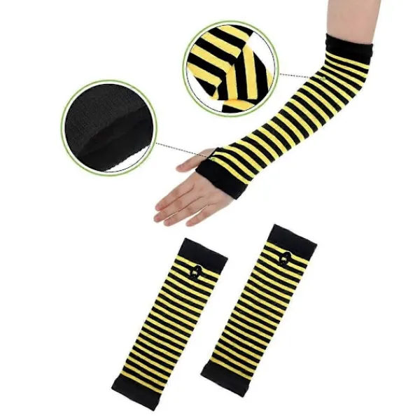Bi-strumpor och handskar: Dessa knähöga strumpor och fingervantar är designade med svarta och gula ränder, som är trendiga och levande i färgen, vilket modifierar kurvorna på dina armar och ben; Dessa benvärmare och armvärmare är gjorda av högkvalitativt material, som är hudvänligt och andningsbart, inte lätt att blekna och andas, och kan följa med dig under lång tid