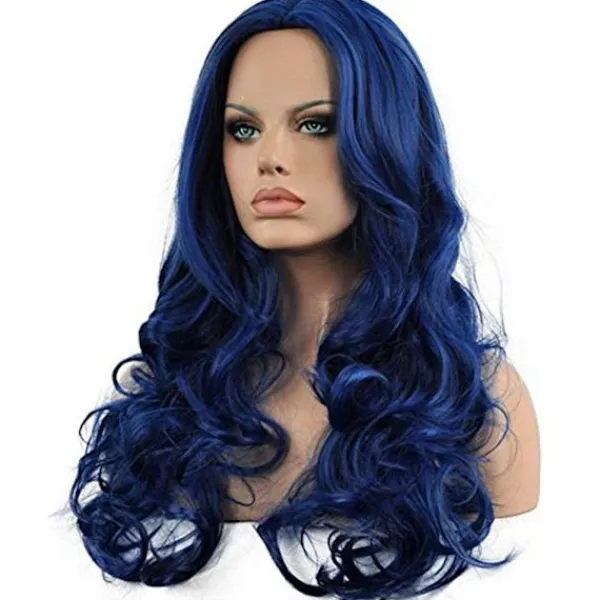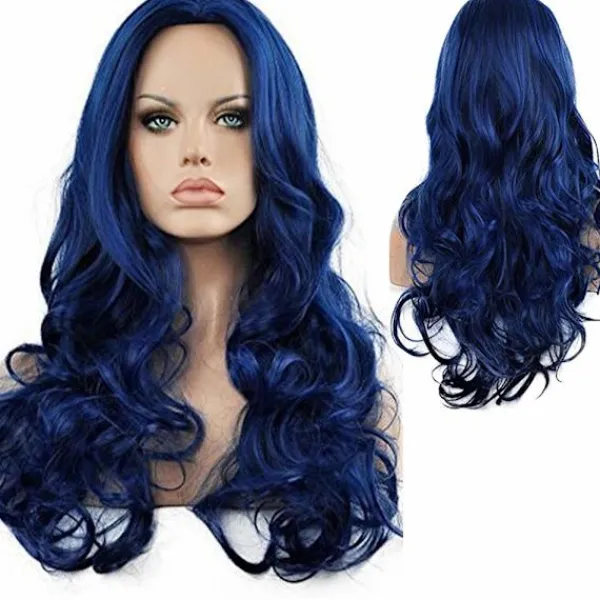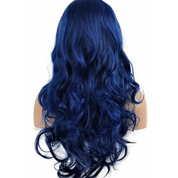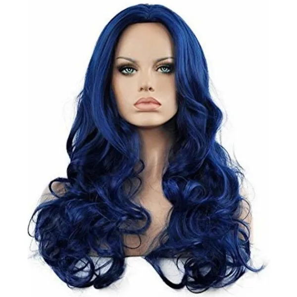【Blå vågig peruk】– Denna peruk för kvinnor använder värmebeständig syntetisk fiber, mjuk och slät.