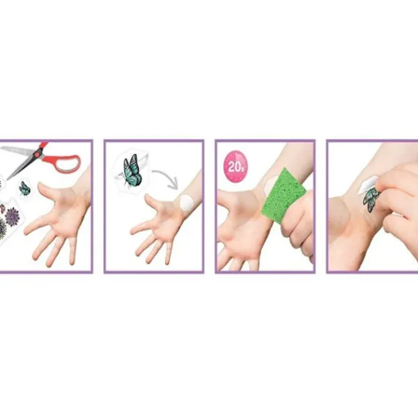Välj en design bland de 75 tatueringar som erbjuds och applicera den på din hud. Tatueringar är tillfälliga och tvättbara.
