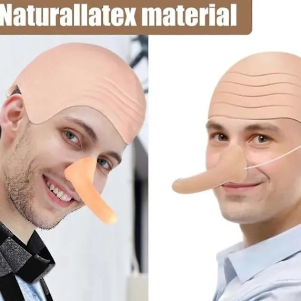 Den skalliga mössan är gjord av latex och är justerbar för att passa alla huvudstorlekar. Perukmössan håller håret på plats. Den långa näsan är gjord av vinyl och halsduken är av mjuk, hudvänlig bomull.