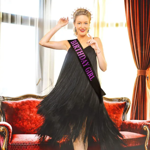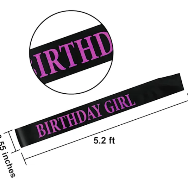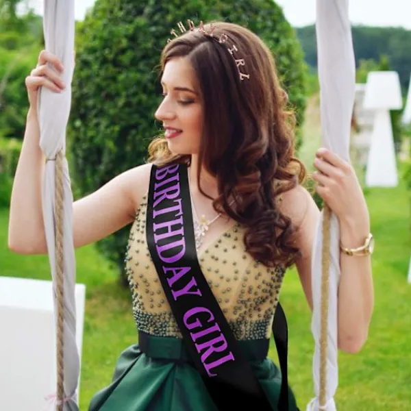 Design: glittrande bokstäver på det släta satinskärpet och pannbandet kommer att dra till sig uppmärksamhet och gästerna kommer att veta att du är födelsedagsbarnet