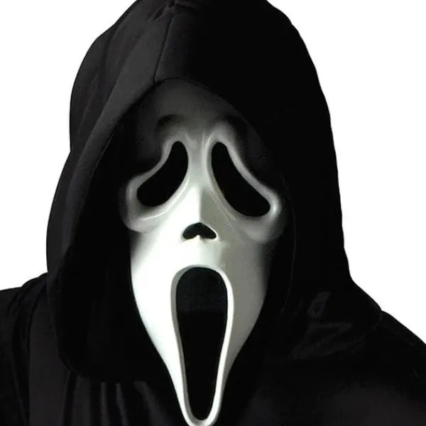 Skrikmask med fastsatt svart huva.