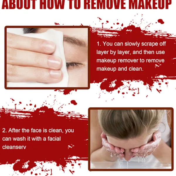 Innehåller: Hudvax * 1 st + falskt blodgels * 1 st + ärrvatten * 1 st + falskt blodspray * 1 st + svamp * 3 st + silverskrapa * 1 st