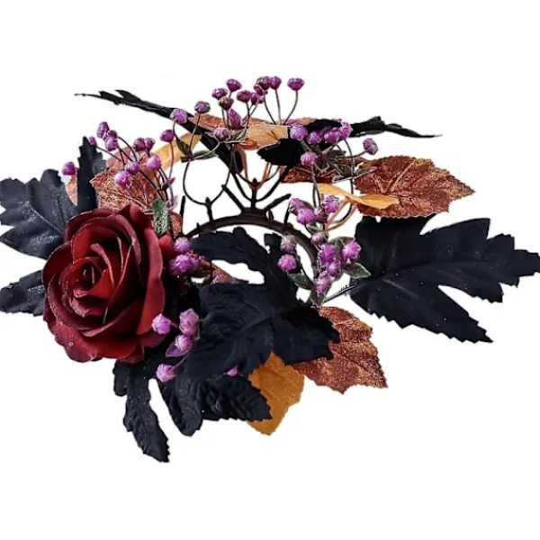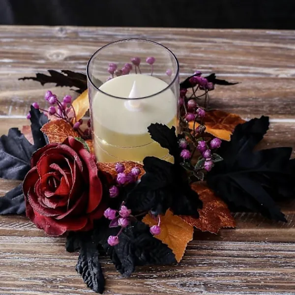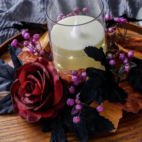Skapa en ryslig stämning med våra Halloween-ljusringar! Den konstgjorda röda rosen, tillsammans med svarta och gula lönnlöv, kompletterar svart inredning perfekt och ger en kuslig effekt till alla miljöer.