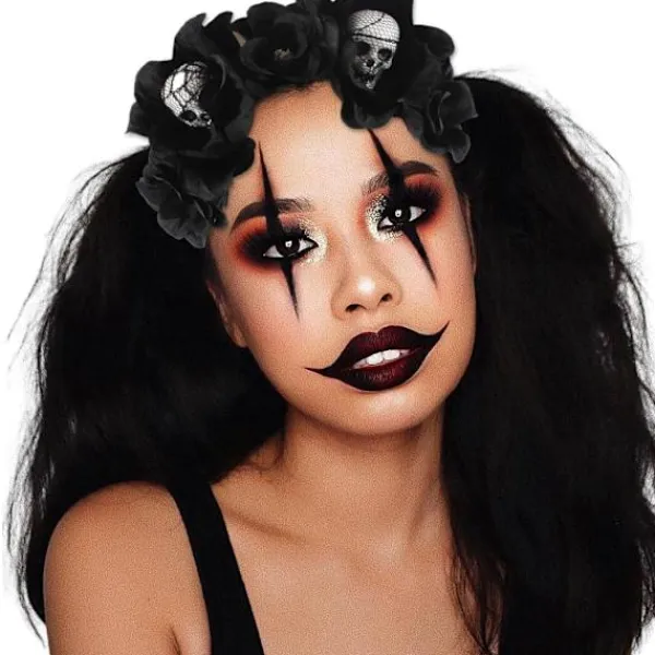 Blomsterkronhuvudbandet är tillverkat av svarta blommor och skrämmande skumdödskalledekoration/svart slöja. Alla dessa detaljer gör detta Dödsdagens huvudband extra romantiskt och festligt för dina semesterkostymer och kläder.