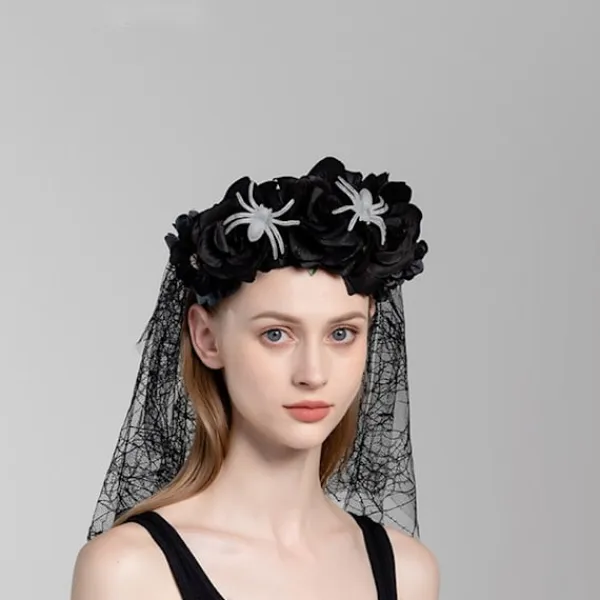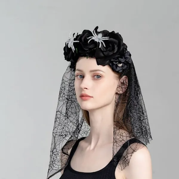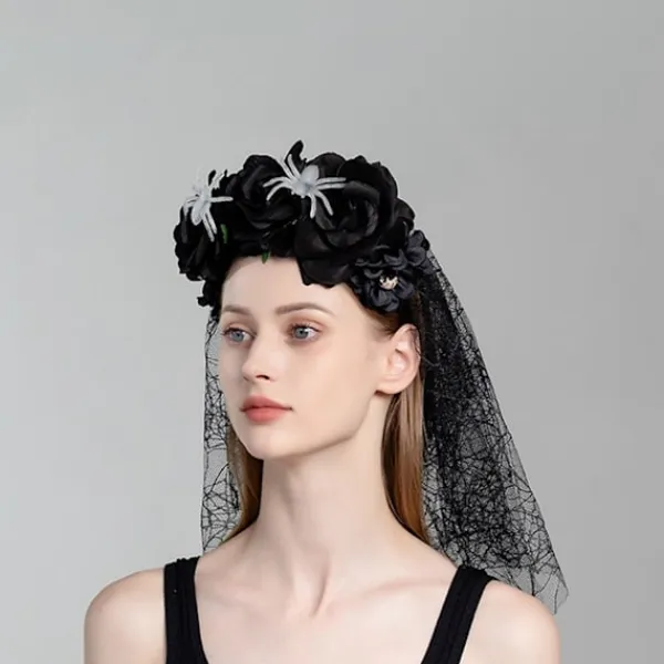 Denna svarta slöja i konstgjord blomsterspets med rosdekorationer är det perfekta tillbehöret för att lägga till en elegant och mystisk touch till din Halloween-kostym.