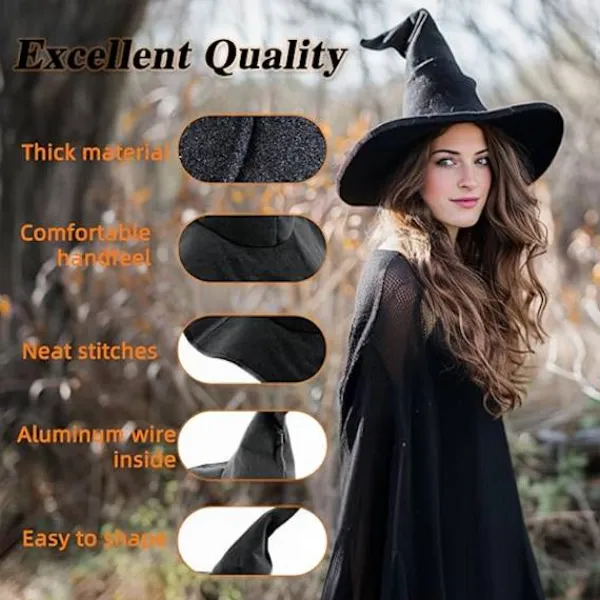 Premiummaterial: Häxhatten är tillverkad av premium, förtjockad filt och är mjuk och bekväm att bära. Under kyliga nätter håller den dig varm medan du kastar besvärjelser och brygger trolldrycker.