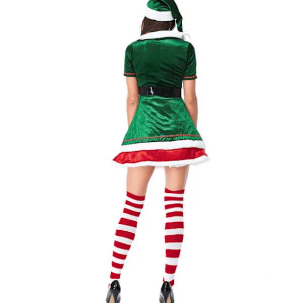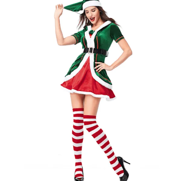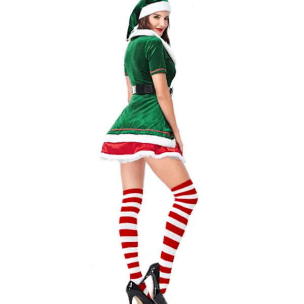 Unik design: Denna elfjulkostymdesign är väldigt unik. För att få dig att sticka ut på julfesten parade vi ihop med rödrandiga strumpor, kjolens färg är klassiskt grön och kjolen är omgiven av stort rött. Den här klänningen kan sägas vara ganska attraktiv och lämplig för dig.
