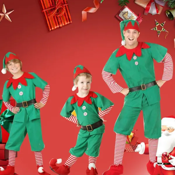 Ett set med alla tillbehör: Vår dräkt har en hatt, ett bälte, ett par strumpor, vilket sparar mycket tid eftersom du inte behöver köpa alla dessa separat. Jultomte-dräkter för barn och vuxna, jultomte-dräkt, jultomtens hjälpreda