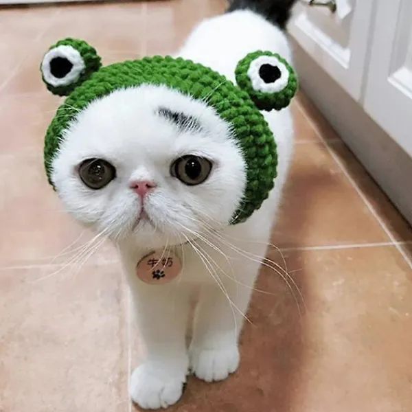 Storlek: Huvudomkrets 26-28cm, Passar för kattungar och valpar. Vikt: 16g. Material: Detta fina kattdiadem är tillverkat av ullgarn, mjukt och bekvämt, varma mössor på hösten och vintern, inte bara för söt grooming, utan också söta. Design: söt groddesign, mycket vacker och söt, perfekt dekoration för att göra ditt husdjur mer stiligt och modernt. Funktion: Den har bra skydd för husdjurets huvud och kan förhindra att husdjurets huvud påverkas av den kalla vinden på vintern. Den passar för alla tillfällen, som festivalfest, födelsedagsfest, vardagskläder eller fotografering.