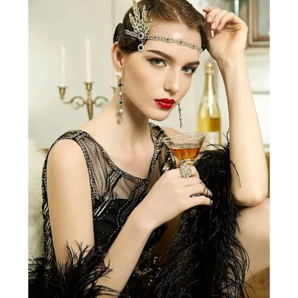 Huvudbonad i The Great Gatsby-stil: Material: legering, imitationspärlor och elastiskt band. Vintage-hårband med fjädrar och pärlor, storlek: one size, passar de flesta. Detaljerad information