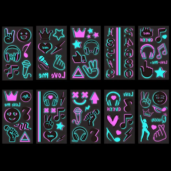 Iögonfallande Nattbelysning: Stick ut på alla evenemang med dessa självlysande temporära tatueringar. Perfekt för musikfestivaler, konserter, fester och nattklubbar, dessa tatueringar avger ett levande sken under UV-svartljus, vilket säkerställer att du är i centrum för uppmärksamheten. Den tvåfärgade ljuseffekten ger ett extra lager av visuellt tilltalande, vilket gör dem idealiska för ravefestivaler och andra nattliga fester. Dessa tatueringar är utformade för att förbättra ditt utseende och skapa ett minnesvärt intryck, vilket säkerställer att du lyser starkt vart du än går. De är också bra för att lägga till en rolig och unik touch till vardagliga outfits.