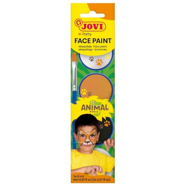 Jovi Animals barnsmink är utformat för pojkar och flickor från 3 år. Detta kit innehåller tre flaskor om 8 milliliter vardera, med starka och täckande färger: vit, orange och svart. Färgerna kan blandas för att skapa varierade effekter. Sminket levereras med en svamp och en platt pensel för enkel och precis applicering. Dess behagliga och släta textur säkerställer optimal komfort vid appliceringen. Dermatologiskt testad, är denna produkt giftfri och tillverkad i Spanien. Den är idealisk för barnfester, födelsedagar, karnevaler, Halloween, festivaler, teaterföreställningar eller sportevenemang. Sminket rengörs lätt med en fuktig trasa eller med tvål och vatten. Presenterat i en praktisk flaskformat, möjliggör den en direkt applicering utan att behöva vatten, tack vare dess oljebaserade formel som förhindrar att produkten torkar. Artikelns dimensioner är 20 mm i bredd, 58 mm i längd och 235 mm i höjd. Observera att denna produkt inte är lämplig för barn under 36 månader på grund av små delar som kan sväljas. Det rekommenderas att den används under övervakning av en vuxen. Detta smink är perfekt för att komplettera kostymer och ge en sista touch till utklädnader.