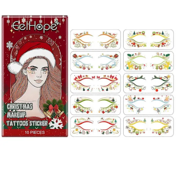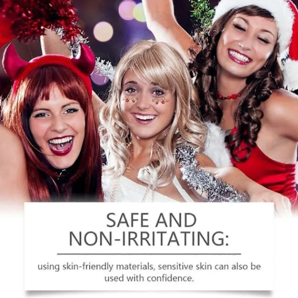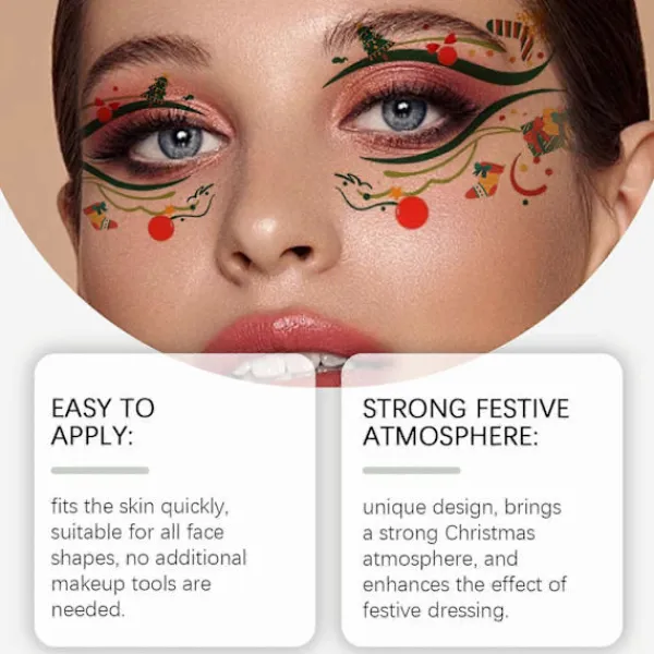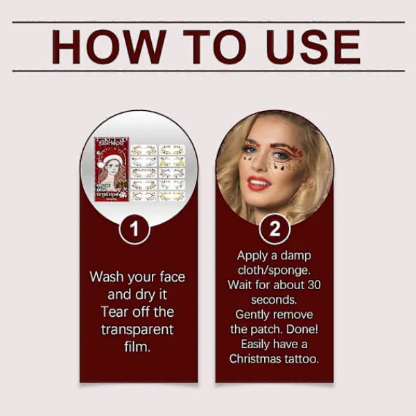 Våra jul ansiktsdekaler innehåller vattenöverföringstatueringar och PE-film, som snabbt passar alla ansiktsformer utan behov av extra sminkverktyg. Applikationen är enkel: tvätta och torka ansiktet och dra av den transparenta filmen. Applicera en fuktig trasa/svamp och vänta cirka 30 sekunder för att försiktigt ta bort plåstret. Klart! Lätt att få jultatueringar. Och användningen av unik design ger en stark julstämning och förstärker effekten av högtidsklädsel.