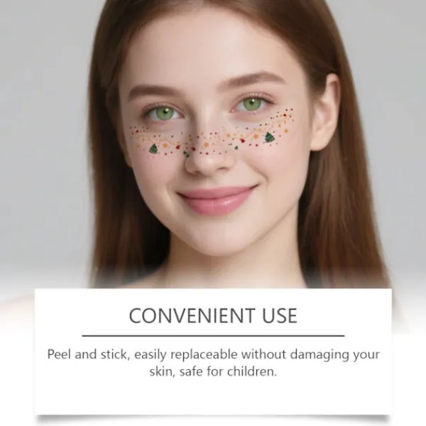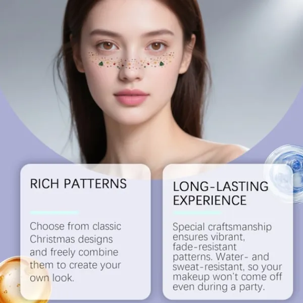 【Omedelbar Glamour på Sekunder】: Inget lim, inget kladd – bara dra av, tryck och gläns! Dessa tillfälliga glitterfräknar appliceras enkelt och sitter på plats hela natten, perfekt för sista minuten-förberedelser inför festen eller spontana julselfies.
