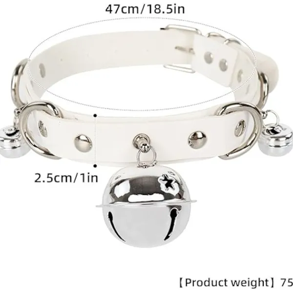 Justerbart halsband: Läderhalsband med justerbart spänne, lämpligt för en mängd olika halsomkretsar, bekvämt att bära. Halsbandet levereras med tre små klockor för ökad intresse.