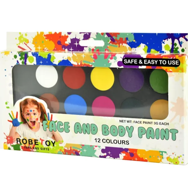 Ansiktsfärger som är enkla att måla på och enkla att tvätta bort. Tolv olika färger gör att du kan måla nästan vad du vill. Måla på dem med hjälp av de medföljande penslarna eller dina fingrar. Tvättas bort med tvål och vatten. Ansiktsmålning brukar vara ett uppskattat inslag på t ex barnkalaset. Passar bra till kalaset, maskeraden eller Halloween.